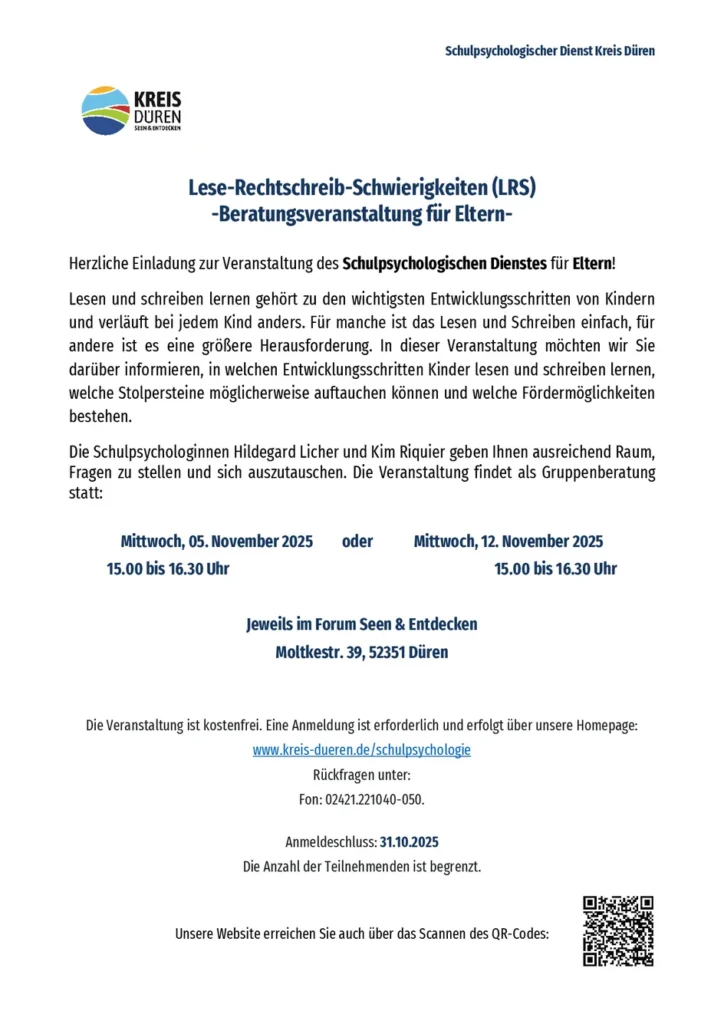 Anmeldung: Anmeldung zur LRS-Beratungsveranstaltung für Eltern